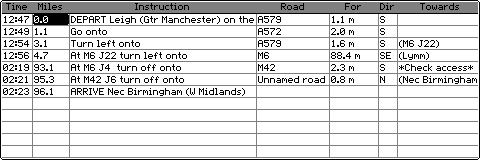 Routes can be displayed in tabular form, and printed using a parallel printer. Speeds and feeds (sorry) can be adjusted for different road types.