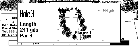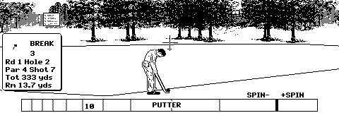 The game allows for practice or competition mode, with a range of clubs and a stroke system like other games. Left and right to line up shot, and three presses of the space bar to swing: start, power and spin. I know nothing of golf, but picked this up quickly enough to play a few holes.