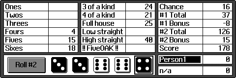 Over 13 rounds, roll three times. Aim to build the best hand and then score. Every hand must be scored on the score sheet, and you may only choose one type of scoring once. If you score a high straight early, and then score a better high straight later, you may not change your score card. It’s not a bad way to pass the time, but for me, tires quickly.