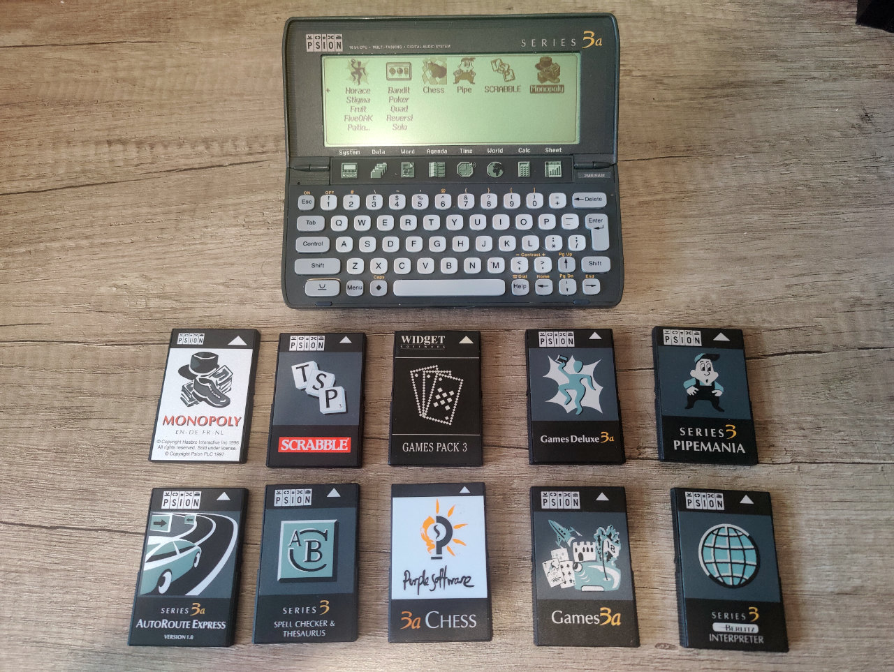 Similar to less popular handheld of the era, the Gameboy, the Psion used a proprietary cartridge format for distributing commercial software. Psion sold blank cartridges, flashing hardware and duplicators to software houses, as well as releasing a number of titles under their own license. There’s a wide range of commercial software available for the Series 3 family, and only some of it was ported to the Series 5 (I really wish Scrabble had been released on Series 5).