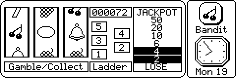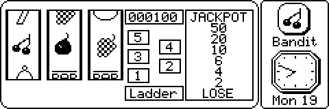 A very standard fruit machine with three rotating drums, bar, hold, nudge and gambling features. By KP Holloway for Widget Software, copyright 1992.
