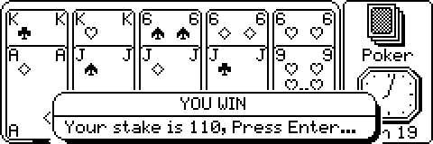 Texas hold-em style poker. Up to three changes per hand plus a bet before call. By KP Holloway for Widget Software, copyright 1992.